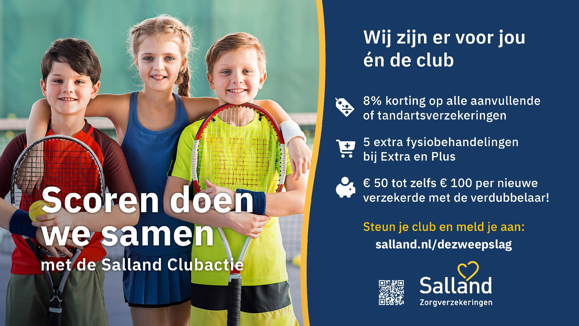 Wij doen ook dit jaar weer mee aan de Salland Clubactie. Met deze actie scoor je niet alleen voordeel voor jezelf, maar ook keiharde euro’s voor onze club! Hoe meer leden zich verzekeren bij Salland, hoe hoger het sponsorbedrag dat direct naar Tennisvereniging De Zweepslag gaat, dat betekent: meer middelen voor materialen, jeugdactiviteiten of clubfaciliteiten.
